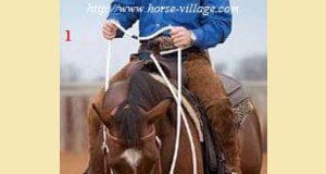Pour bien prendre les rênes, équipez-vous d’un simple snaffle* et roping reins, ou comme sur les images, d’une mecate. Bien sûr il est possible de faire l’exercice avec des « split reins** », mais pour commencer il est plus facile avec les rênes fermées. Marquez le milieu exact de vos rênes avec un scotch. C’est votre point de récupération , le point qui va faire que vos rênes ont toujours la même longueur de chaque côté. C’est aussi là où vous prenez vos rênes après un exercice ou pour les raccourcir. Si vous montez avec la mecate, passez la « ...