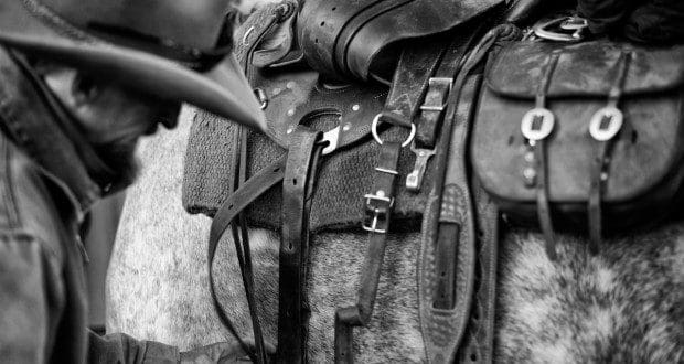 – Un cow-boy enlève ses armes et éperons avant d’entrer dans une maison.