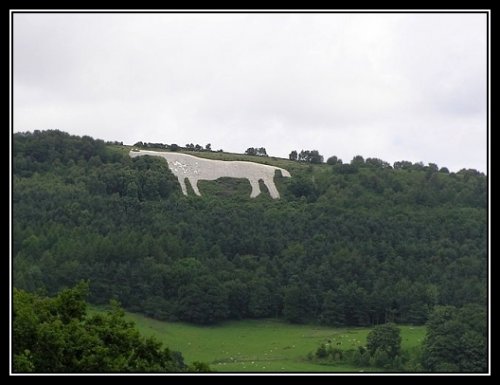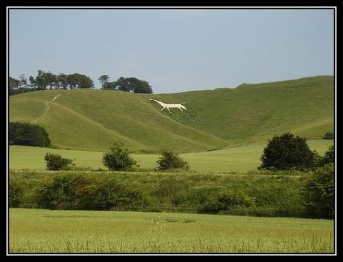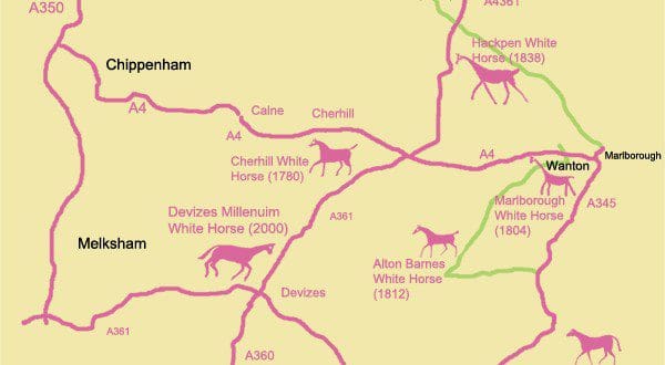 Non loin du site mondialement réputé de Stonehenge, dans le Wiltshire, le sol n’est pas fait de terre mais de craie blanche, les géoglyphes de chevaux sont formés dans cette craie des collines. Selon la technique la plus ancienne, une tranchée était creusée pour être remplie de pierre crayeuse et calcaire qui tranchait sur le vert des prairies et ainsi, était visible de loin.