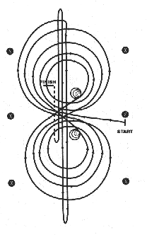 – Départ au galop à droite (start), petit cercle à droite et grand cercle à droite