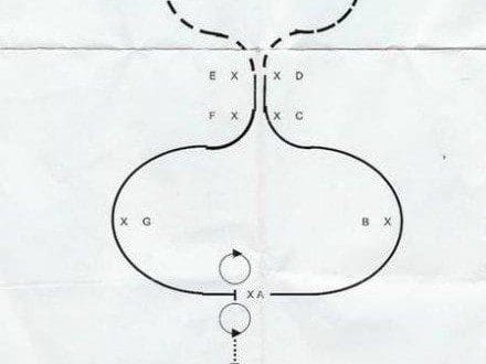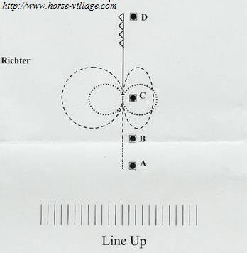 2) C au pas, stop, reculer env. 3m, puis jog en diagonale jusqu’à D, au pas, galop à droite sur un cercle puis changer de cercle sans changer de pied, au pas sur env. 3m puis au jog jusqu’au line up.