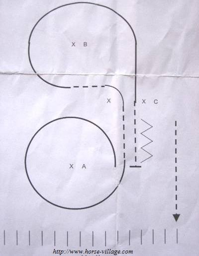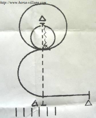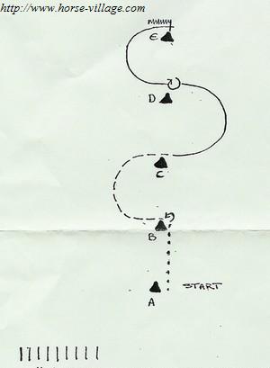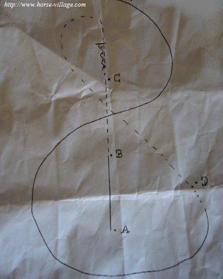 4) En C départ au galop à gauche, en D stop et reculer 5 pas